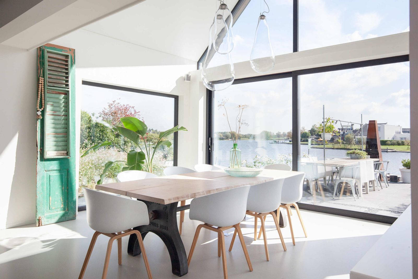 Frederic: “U hoeft niet alle kozijnen en deuren in dezelfde kleur te nemen. Kunststof kozijnen in papyrus wit met houtnerf kunt u bijvoorbeeld mooi combineren met een houten deur en twee kleine aluminium kozijnen. Eén van mijn mooiste realisaties, prachtig!”